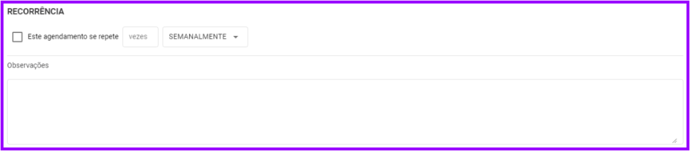 3. Caso o agendamento tenha necessidade de uma recorrência, selecione a quantidade de vezes que se repete e seu intervalo, entre semanal, quinzenal, ou mensal. Logo abaixo há também o espaço para adicionar uma observação geral, ficando disponível no perfil do paciente: