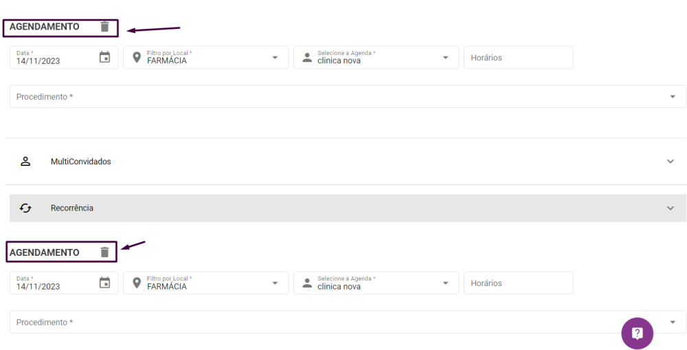 Após clicar no ícone , surgirá mais um campo para agendamento na mesma tela, conforme mostrado na imagem abaixo. Para reduzir a quantidade novamente, basta clicar no ícone da lixeira.