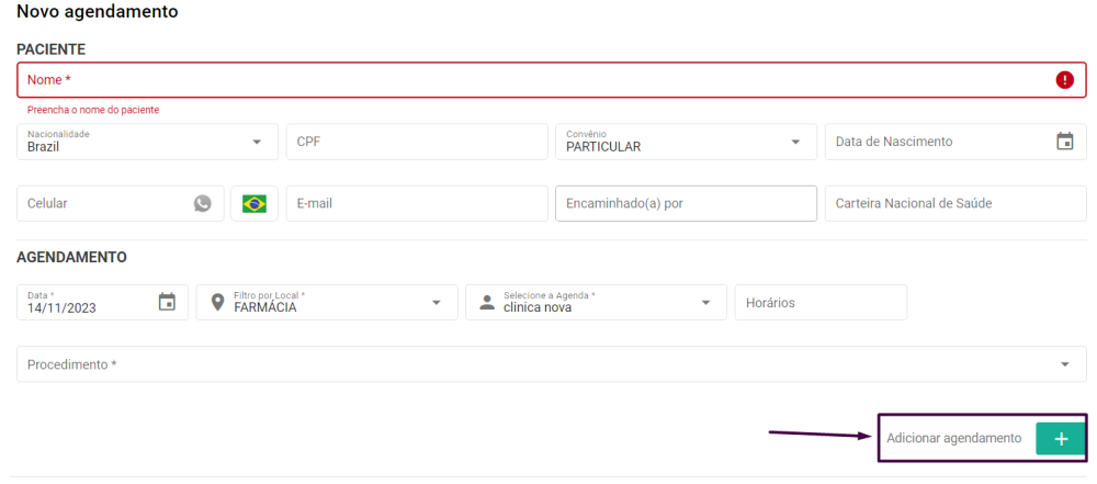 O botão destacado em roxo na imagem acima deve ser selecionado quando houver necessidade de gerar mais de um agendamento para um determinado paciente.