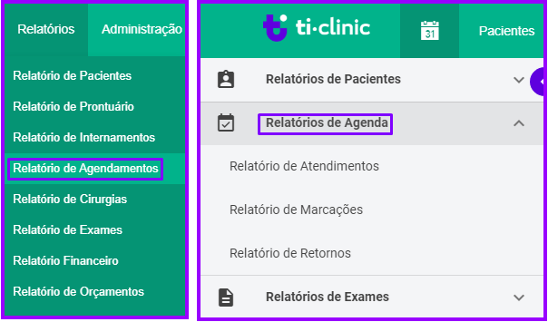 Para gerar relatórios referentes a filtros da agenda, como atendimentos e marcações, clique em “Relatórios” nas abas acima, então em “Relatórios de Agendamentos”. Na página de relatórios, pode ser acessado ao selecionar a aba “Relatórios de Agenda” à esquerda: