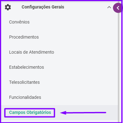 Para fazer a seleção de informações obrigatórias para o cadastro de novos pacientes, selecione “Campos Obrigatórios” na aba de configurações gerais: