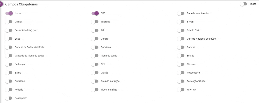1. Nessa página, selecione as informações que deseja ser obrigatório o preenchimento para o cadastro de novos pacientes. Apenas o espaço “Nome” é impossível desabilitar.