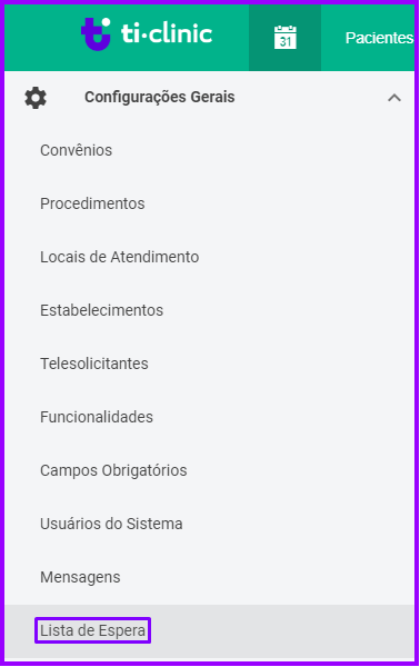 Para criar e editar listas de espera de pacientes para atendimento, selecione “Lista de Espera” na aba de configurações gerais: