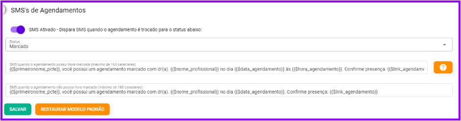 - Caso desejado, você poderá voltar ao modelo padrão de SMS de agendamento do sistema ao clicar em