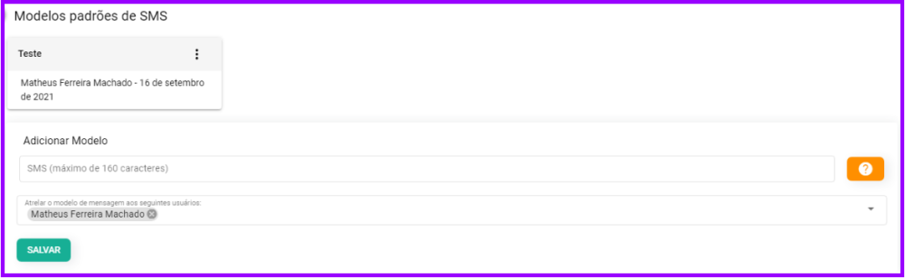 1. Edite um modelo de SMS que deseje criar para uso geral, como por exemplo para mensagens enviadas pelo prontuário eletrônico, e atrela-los aos usuários da plataforma que terão acesso: