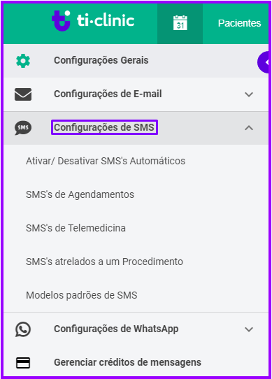 Para configurar modelos de SMS e disparos automáticos, selecione, na área de configurações de mensagens, a aba “Configurações de SMS”: