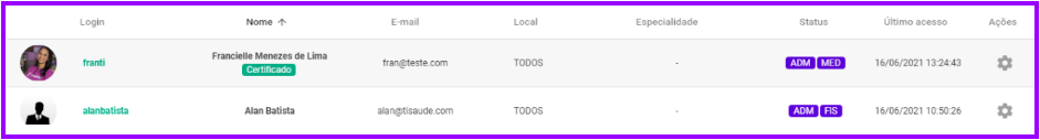 1. Nesta página você terá acesso a todos os usuários ativos do sistema, mostrando seu login, nome, e-mail, local de atendimento, especialidade, status (administrador, Conselho de medicina), e por fim seu último acesso ao sistema:
