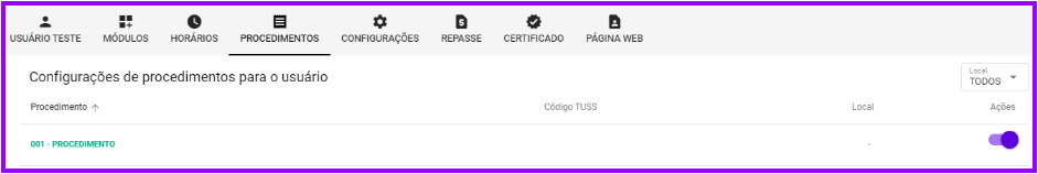 Na aba de procedimentos, o administrador pode configurar os procedimentos que este usuário executa, separando por locais de atendimentos: