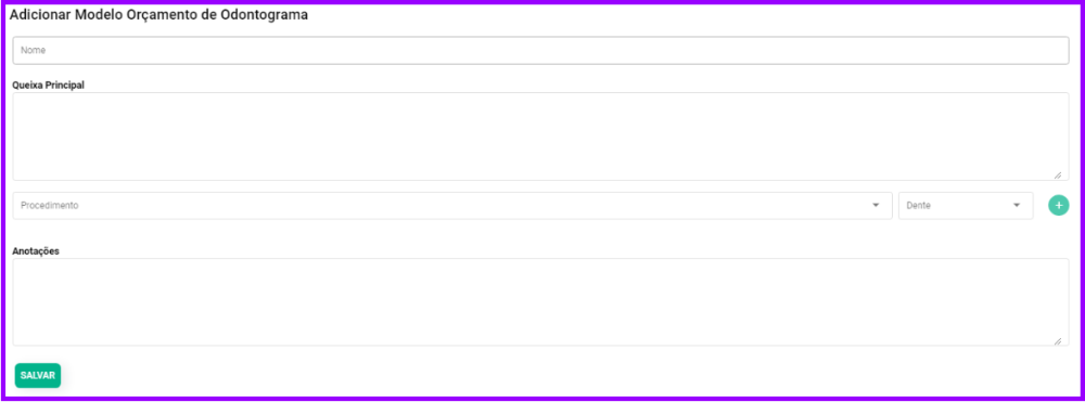 2. Adicione as informações referentes à esse orçamento: nome, queixa principal (motivo para tal orçamento), procedimentos e os dentes envolvidos, e anotações gerais: