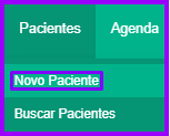 O cadastro de novos pacientes em sua clínica digital pode ser feito na parte de “Pacientes. Para acessar, clique em “Pacientes” nas abas acima, e então em “Novo Paciente”: