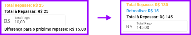 5. Caso seja repassado um valor menor do que a porcentagem estabelecida, no próximo repasse, referente ao mesmo profissional e local de atendimento, mostrará o valor faltante como retroativo. Exemplo: