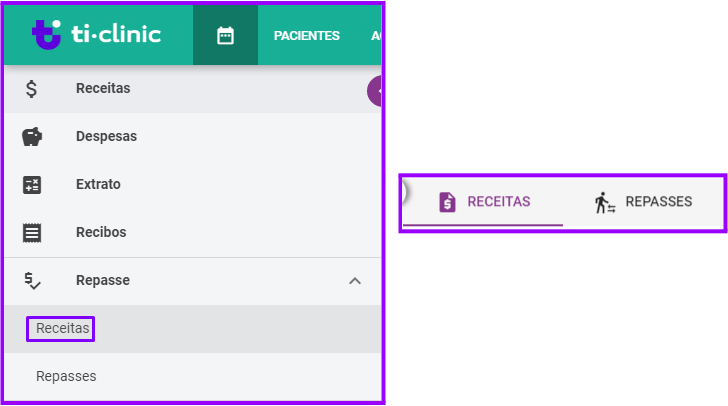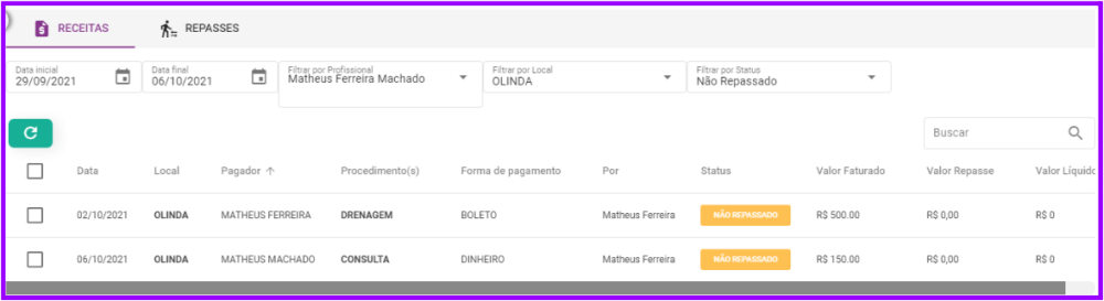 Na aba de “Receitas”, dentro de “Repasses”, ficam listadas todas as receitas da clinica que foram configuradas com o status