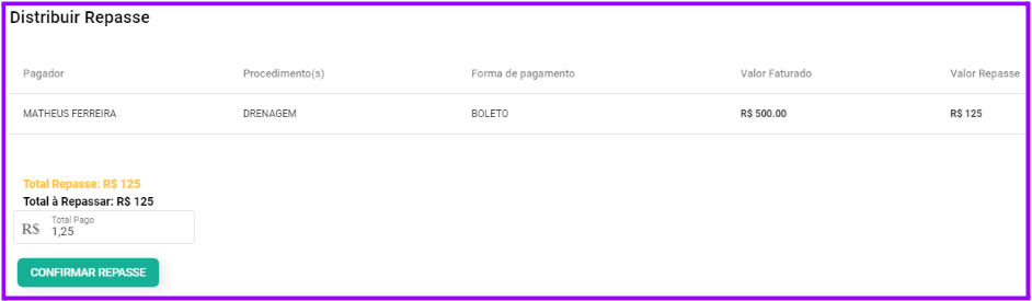 - Digite o valor a ser repassado no espaço de “Total Pago”