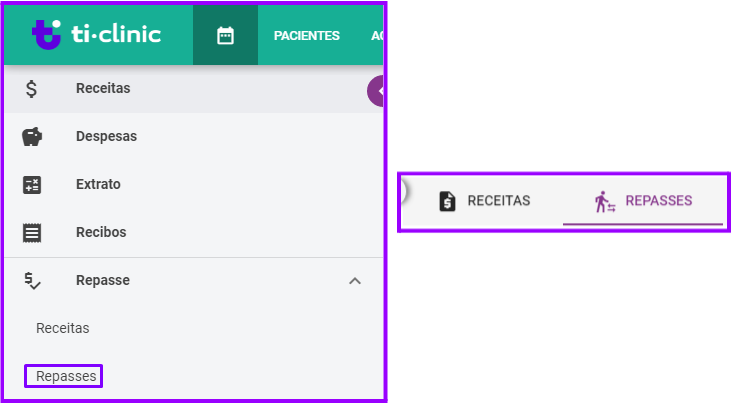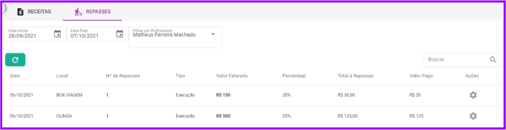 Na aba de “Repasses” ficam listados todos os repasses feitos para os profissionais de saúde da clínica. Para acessar, clique em “Repasses”, dentro da aba “Repasse”: