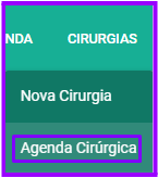 A agenda cirúrgica fica separada da agenda de atendimentos, mostrando apenas as cirurgias marcadas/solicitadas. Para acessar, clique em “Cirurgias” e depois em “Agenda Cirúrgica”: