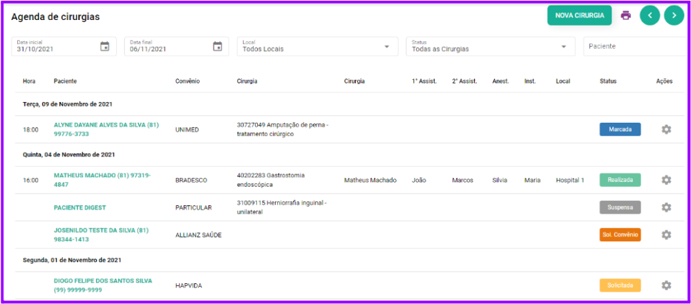 2. Na parte superior da página, você pode selecionar o período que deseja ver as cirurgias dispostas, assim como filtrar por local, status e paciente: