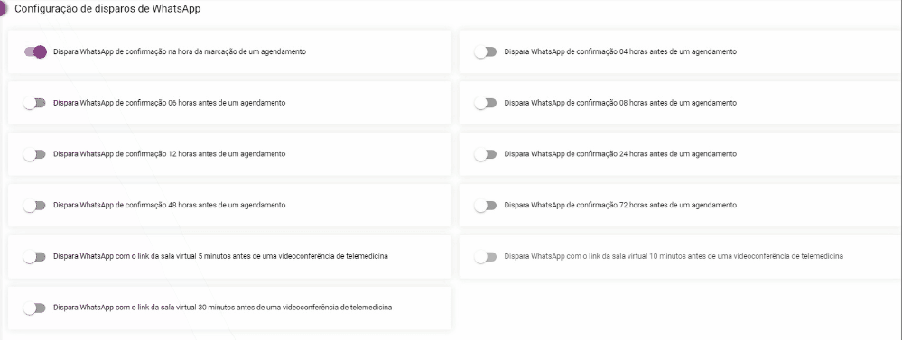 Neste campo existem opções de disparos automáticos de mensagens de WhatsApp em determinadas condições. Por exemplo: É possível disparar mensagem de lembrete para o paciente 6 horas, 12 horas, 24 horas e 48 horas antes do dia do agendamento. Para isso, basta habilitar a opção desejada clicando no íconeContudo, diferente dos E-mails e SMS, não é possível personalizar a mensagem enviada.