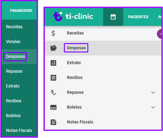 Na aba de “Despesas”, você poderá adicionar e acompanhar as despesas de sua clínica. Para acessar clique em “Financeiro” e depois em “Despesas”, ou então selecione “Despesas” à esquerda, no módulo financeiro: