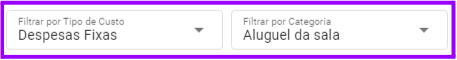 - No espaço “Filtrar por Tipo de Custo” você poderá atribuir um tipo ao custo, e ao lado, em “Filtrar por Categoria”, atribuir uma categoria dentro de um tipo de custo. Exemplo:
