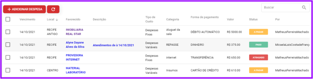 2. Despesas adicionadas ficam catalogadas assim: