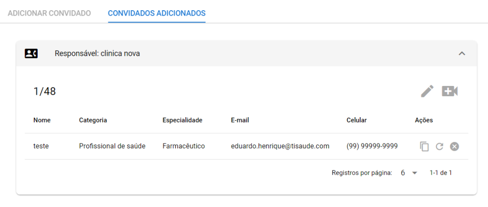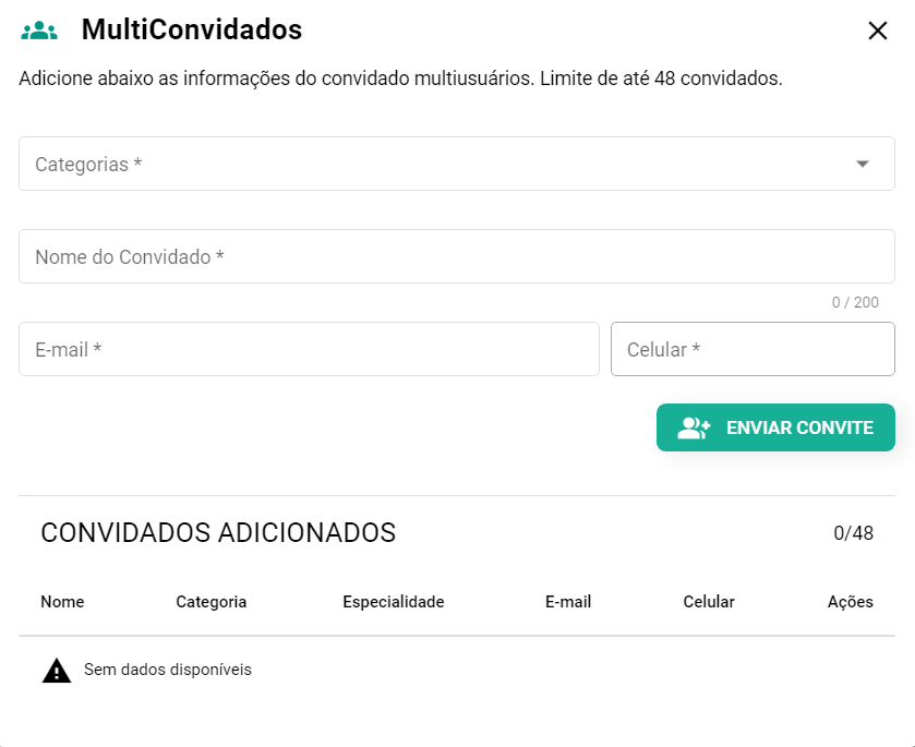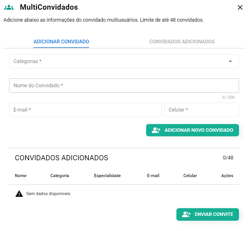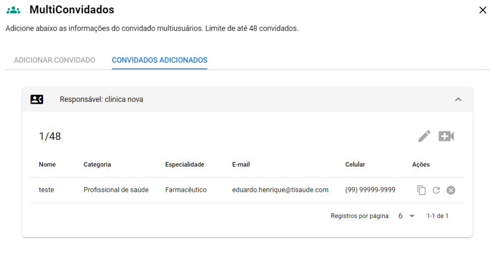 Essa opção estará disponível no momento do agendamento, após o agendamento ser realizado ou durante a consulta através do próprio prontuário do paciente. A finalidade dessa funcionalidade é inserir outra pessoa para fazer parte do atendimento do paciente mediante videoconferência. O convidado pode ser um profissional de saúde, responsável legal, irmã°, cônjuge, namorado(a), amigo(a). Contudo, é importante lembrar que há um limite máximo de 48 convidados. O convite é realizado tanto pelo SMS quanto pelo e-mail ao cadastrar e finalizar o preenchimento.