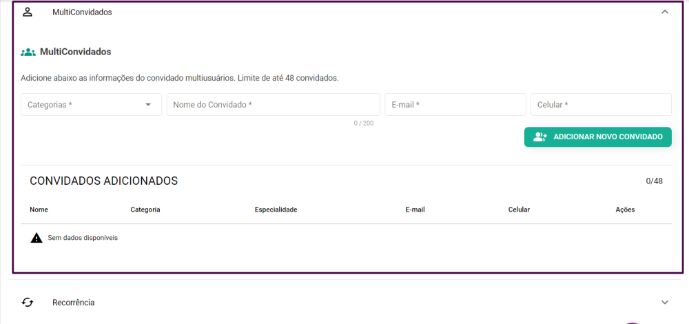 Para inserir durante o agendamento, basta procurar a opção “Multiconvidados” e preencher os campos de “Categorias”, “Nome do Convidado”, “E-mail” e “Celular”. Após isso, basta clicar em “Adicionar novo convidado”, e o mesmo será adicionado no campo “Convidados adicionados”. Dessa forma, caso queira adicionar outro usuário, basta repetir o mesmo processo.