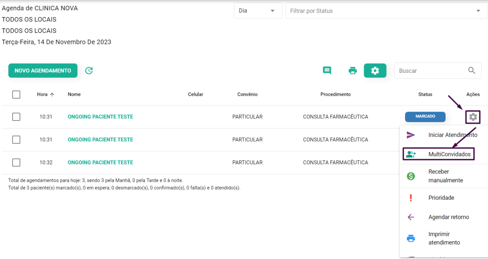 Para inserir após um agendamento ter sido realizado, é necessário clicar no ícone de engrenagem ao lado do agendamento desejado. Após isso, basta clicar na opção “Multiconvidados”