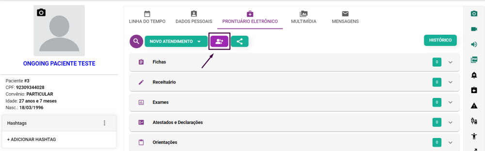 Para realizar a inserção de um convidado durante um atendimento no prontuário presencial, basta clicar no ícone destacado em roxo ao abrir o prontuário do paciente desejado.