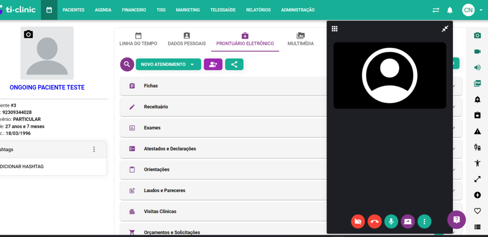 Ao clicar no ícone de “filmadora”, abrirá uma sala de reunião mediante uma tela menor no lado direito do prontuário. A partir disso, conforme os usuários convidados acessarem o link de convite recebido, aparecerá na tela principal para o profissional responsável aceitar ou rejeitar.