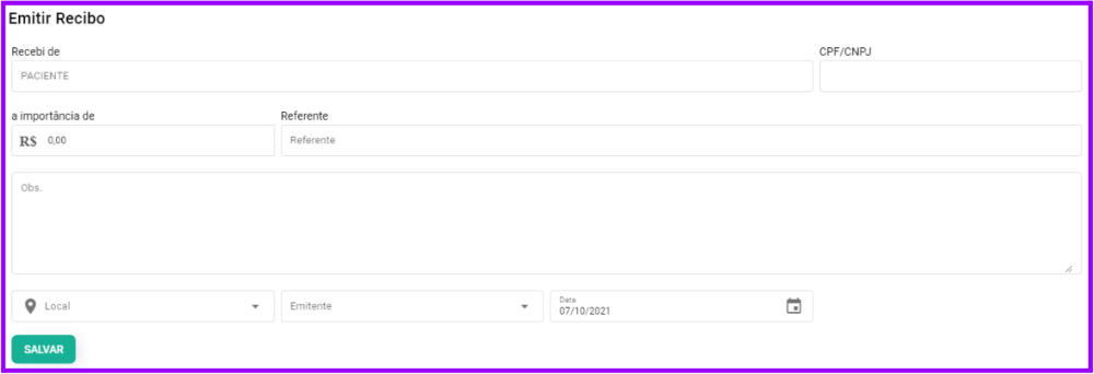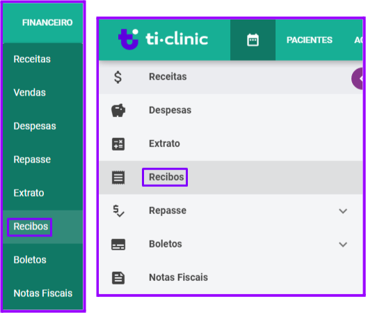 Na aba de recibos você poderá emitir e acompanhar os recibos de sua clínica. Para acessar clique em “Financeiro” e depois em “Receitas”, ou então selecione “Recibos” à esquerda, no módulo financeiro: