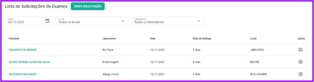 1. As solicitações feitas, na data, local ou laboratório selecionado, aparecem nessa página: