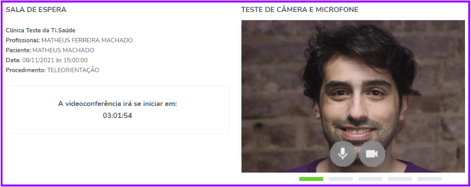1. Primeiramente, caso o paciente entre com antecedência na sala de videoconferência, ele será direcionado para a sala de espera. Nesta sala, o paciente poderá ver detalhes do tele atendimento que participará e uma contagem regressiva para o horário marcado, assim como testar sua câmera e áudio: