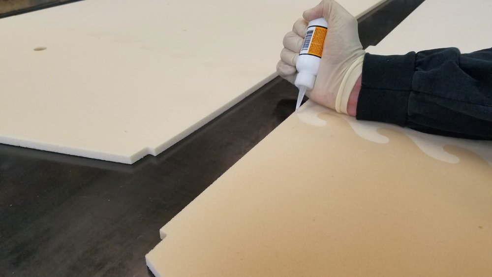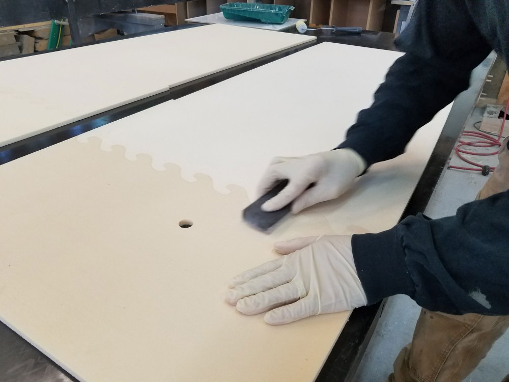 Once they are dry assembled, place wax paper under the joints to keep the panels from sticking to your table. Use a squeegee to force epoxy into the joint, wait a few minutes and then sweep more epoxy into the joint. Then use the squeegee to wipe up any excess epoxy on the surface of the panels to save sanding time later on.