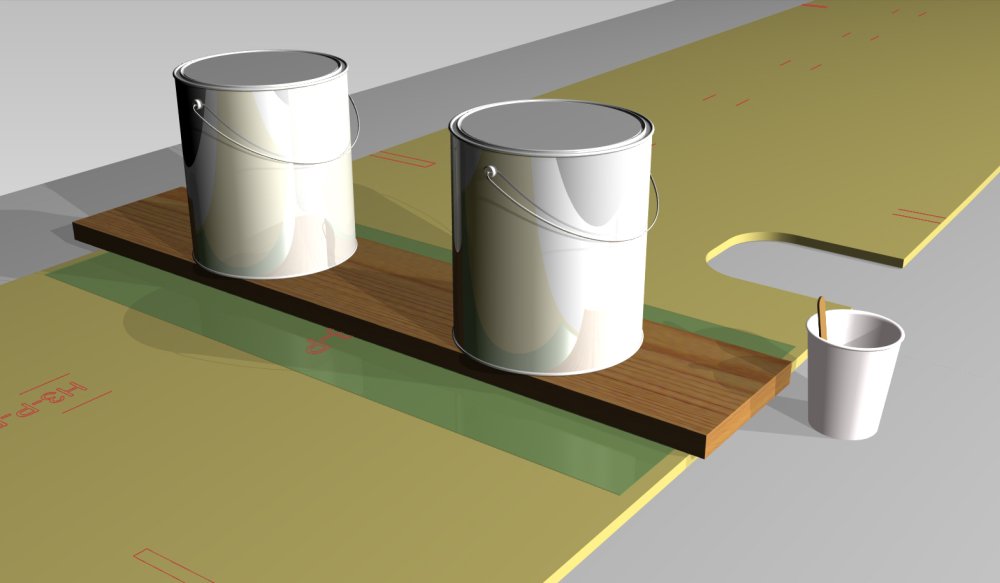 Take care to align the panels without putting sideways pressure on the joints which would miss align the panels- the panels should want to align to make perfectly fair edges. Site down them and adjust until the panel joint looks fair and doesn’t have a kink in it at the puzzle joint. Squeegee off any excess and then place wax paper over the joints. Place scrap pieces of Plywood or Particle board on top of the wax paper and tap with a hammer to make sure they are laying as flat as possible. Then place a weight on top to press the joints flat.